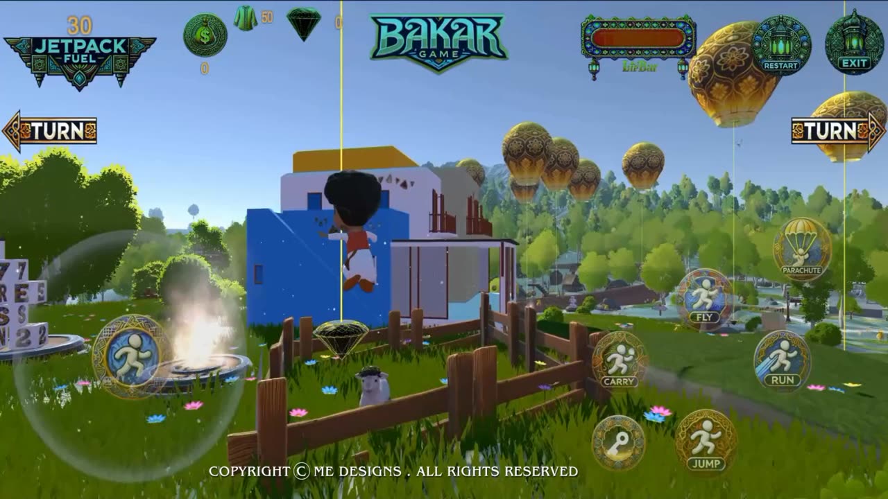 Бакар может передвигаться, прыгать, летать с парашютом 🪂, плавать и нырять. Он также собирает золотые алмазы 💎✨ и монеты 💰 для получения наград, которые помогают в его поисках, например, зарядки его способности летать крыльями фонаря или смены одежды.