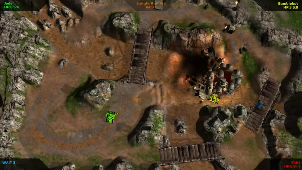 Battletank LOBA — это многопользовательская аркадная игра для Windows и Mac, позволяющая играть вдвоем или вчетвером с помощью до четырех геймпадов (или сочетанием клавиатуры и мыши). Игра предлагает гибкость: если не хватает игроков, вы можете заменить их ботами. Нажимая на имена участников в настройках матча, вы можете изменять их на ботов, и игра будет проводиться автоматически.