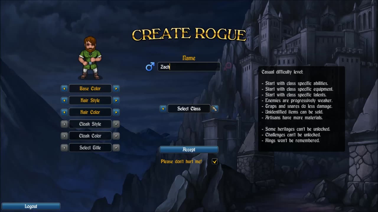Rogue's Tale — это однопользовательская игра в жанре turn-based dungeon crawler, действие которой разворачивается в Frostmourn Keep и окружающих его подземельях на склонах World's End Mountains. Основной целью игры является свержение текущего короля во дворце Frostmourn and becoming the new king.