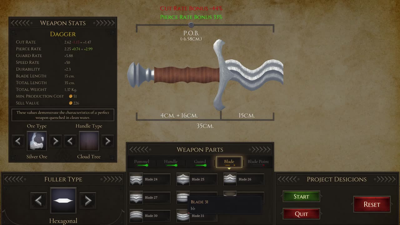 Успех зависит от множества деталей: структура оружия, тип используемых руд и дерева, а также центр тяжести — все это влияет на характеристики оружия. Для создания качественного изделия необходимо правильно смешивать сплавы, изготовлять каждую часть в совершенстве и продемонстрировать мастерство.