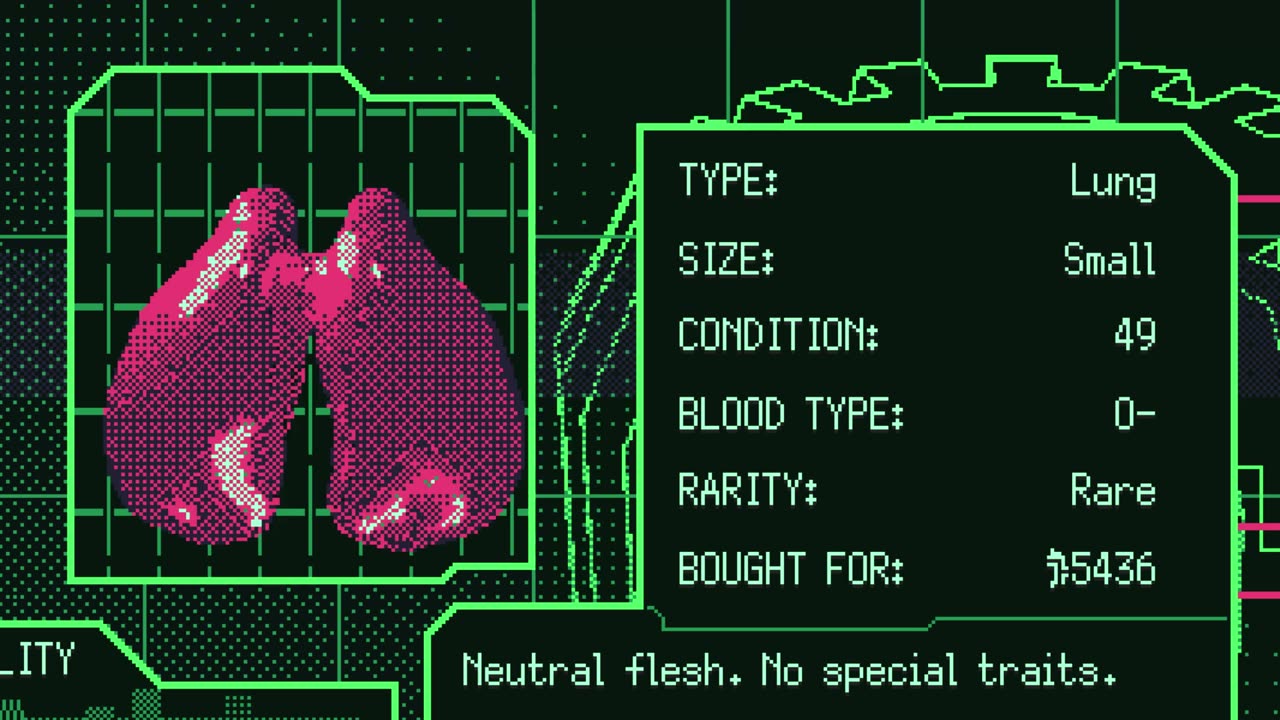 Каждый игрок сталкивается с растущим чувством безумия, когда его действия охватывает осознание того, что человеческие органы становятся товаром. Игра также предлагает захватывающую комедию и глубокую историю от ведущего писателя проектов Hypnospace Outlaw и An Airport for Aliens Currently Run by Dogs.