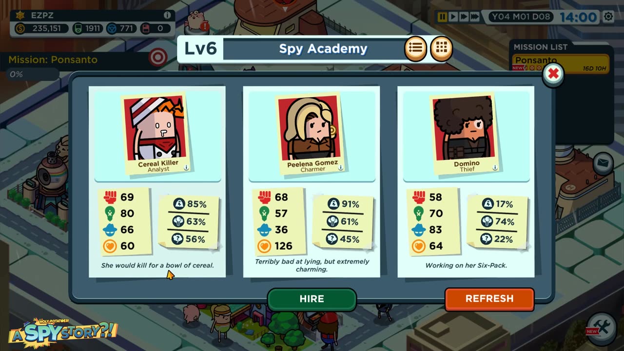 Holy Potatoes! A Spy Story?! — это уникальная игра-симулятор шпионской деятельности, где вам предстоит управлять собственной штаб-квартирой шпионов-картофелин. Вместе с близнецами Реном и Рексой вы отправитесь в путешествие, чтобы раскрыть тайну исчезновения родителей. Управление происходит через вербовку новых агентов, тренировку и улучшение ваших командос-картофелин. В игре представлены эксцентричные гаджеты, транспорт и объекты для проведения миссий. Ваша роль — шпион в тенях, который исполь…