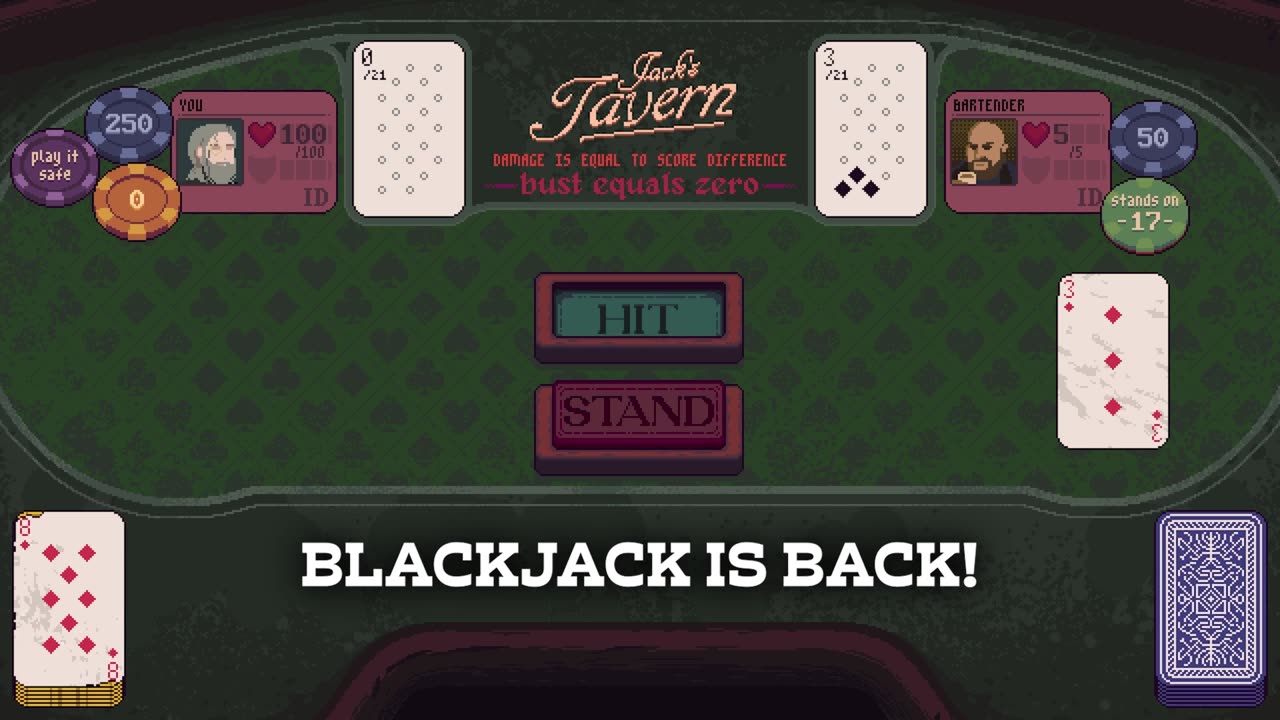 "Погрузитесь в атмосферу Dungeons & Degenerate Gamblers — это игра-рогалик на тему блэкджека с уникальным поворотом. Вас ждет приключение в таверне, где вместо обычного блэкджека вы встретите искаженную версию игры, требующую адаптации под новые правила по мере продвижения. Ваша цель — раскрыть тайну того, кто управляет этим изрезанным казино.
