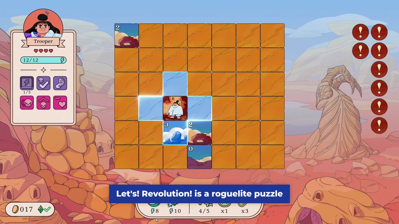 Rise up in Let’s! Revolution!, a roguelite puzzle mashup that combines the classic game of Minesweeper with procedurally generated mazes and turn-based tactics. Your mission is to navigate through enchanting landscapes, evading the rotten King's deadly lackeys while uncovering powerful items and abilities. Each level is an intricate maze, requiring strategic tile-flipping to avoid hazards and discover hidden treasures.