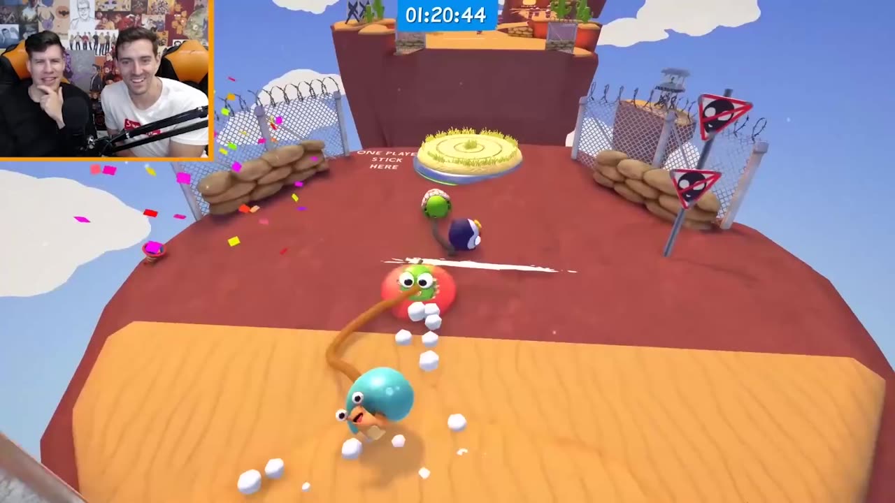 In Fling to the Finish, teams of two players race through colorful, chaotic obstacle courses while tethered by a stretchy elastic rope.