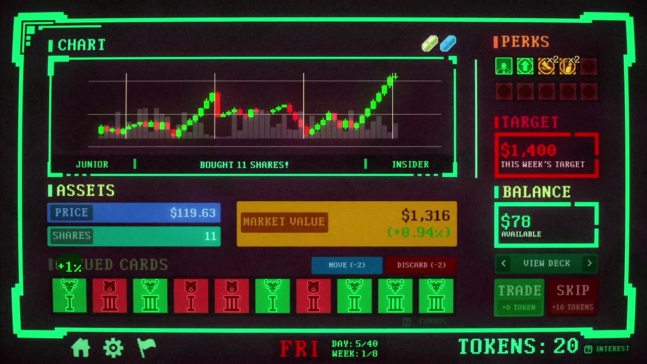 This is not a trading simulator. It is a deckbuilder built with your choices. Between market days, you enter the Aftermarket to draft cards from different pools, often taking upside alongside risk. Some cards strengthen your deck. Others weaken it. When the market opens, the deck you built is the only thing shaping price movement.