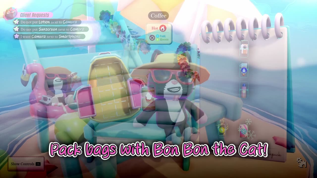 Cozy Travel Mode - Travel around the world alongside BonBon! Fulfill client requests at an Oasis, a Beach or even at Neo-Tokyo by packing their bags in specific ways.