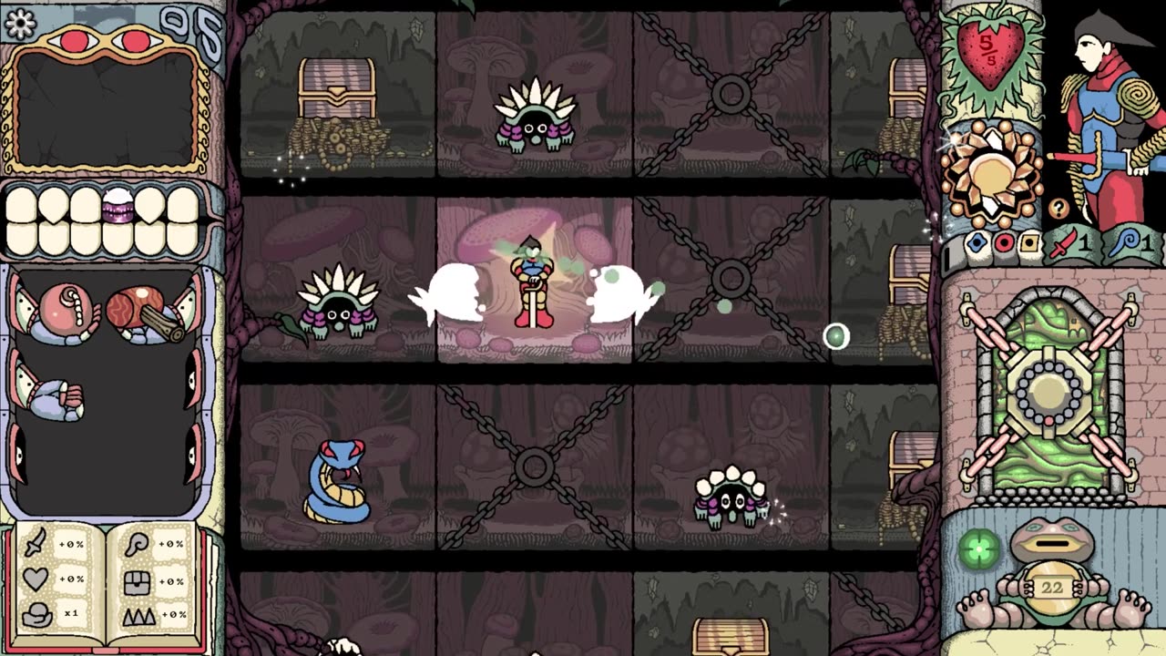 In Sol Cesto, your goal is to descend through the levels of a randomly generated underground world, diving ever deeper in search of the sun, lost for countless years. On the combat grid, choose one of four rows to move into. You'll then land randomly on one of the four tiles in that row: will it be a monster that harms you? A chest full of gold? Or perhaps a deadly poison trap? Anything can happen…